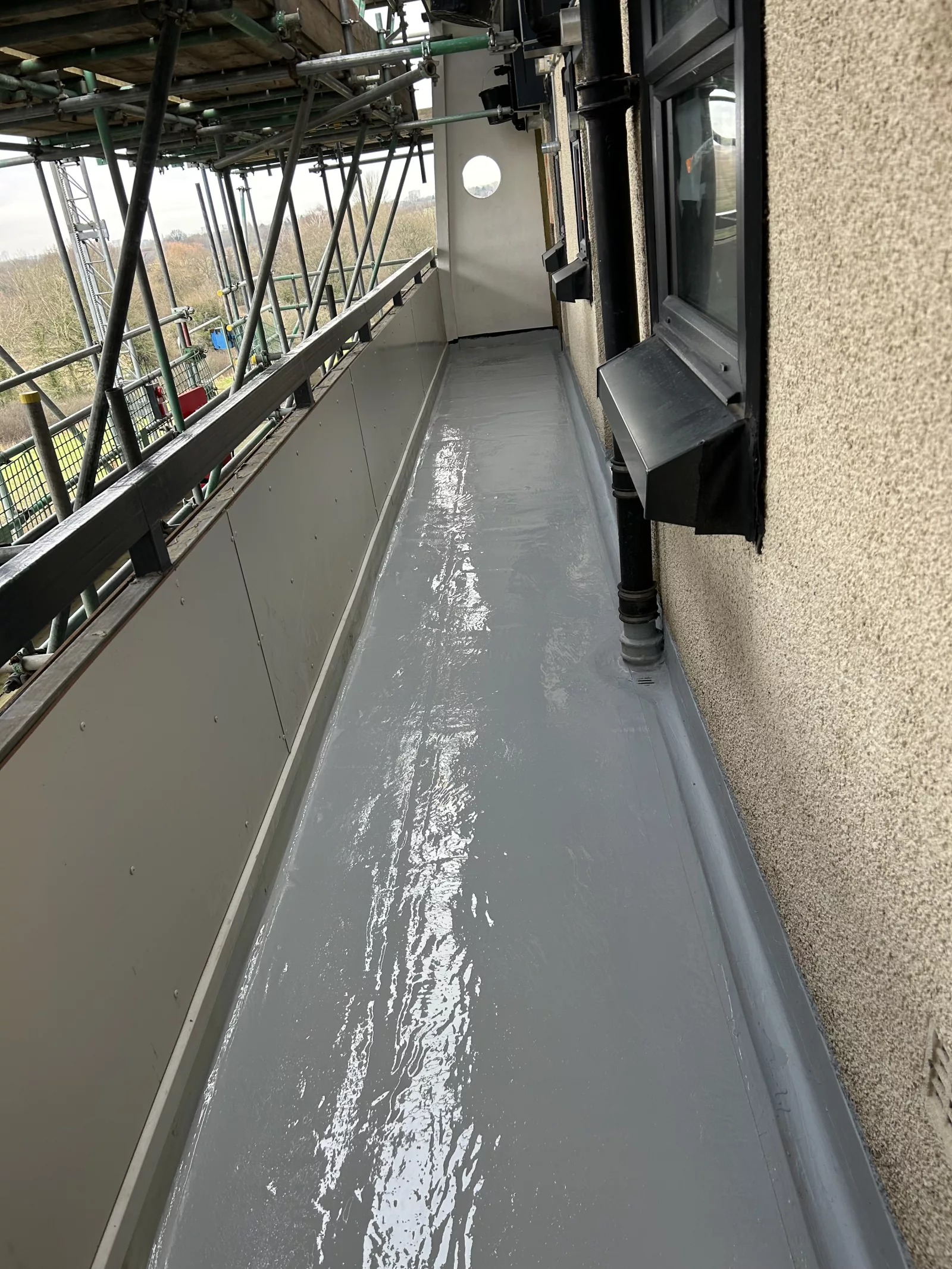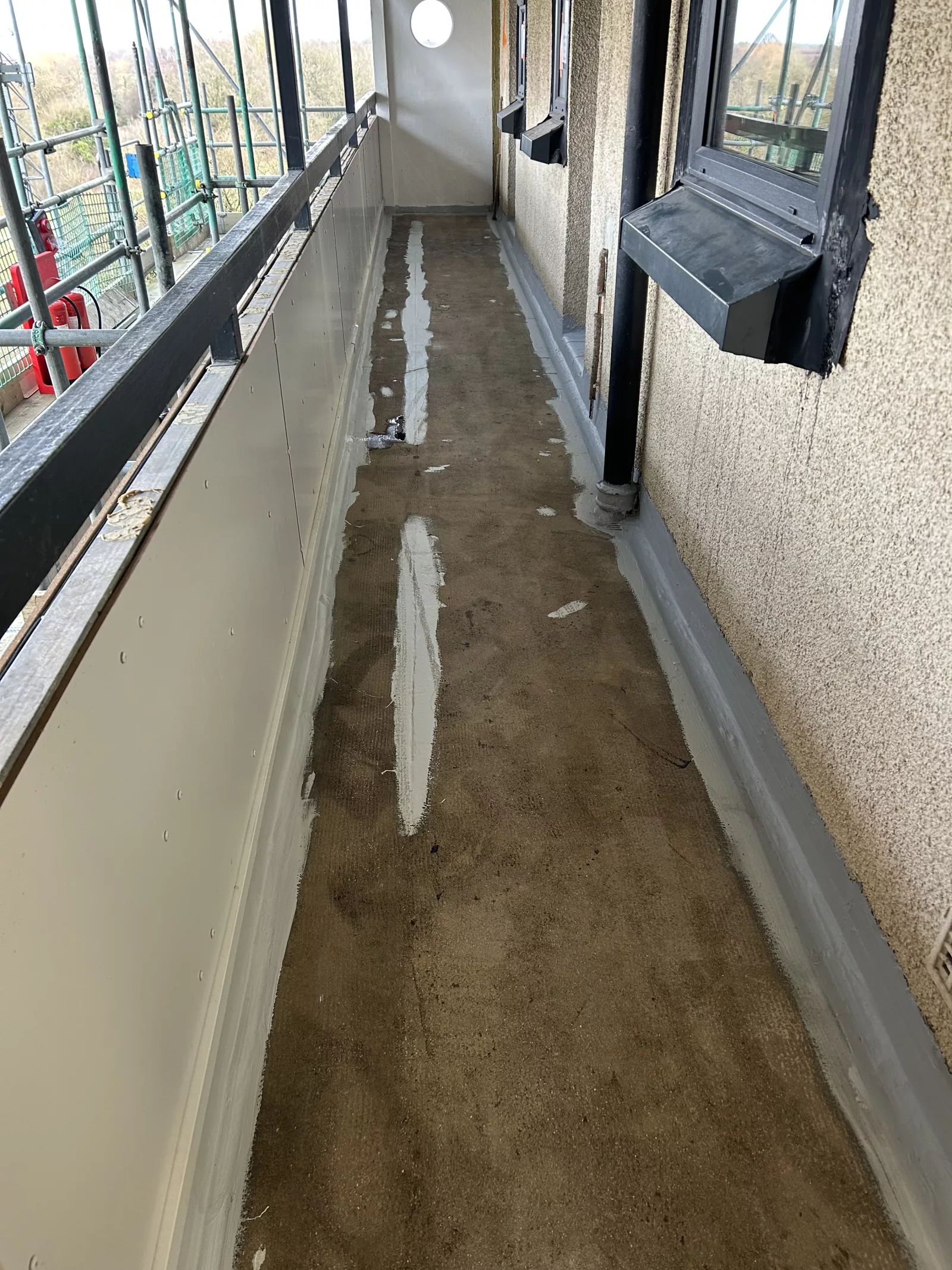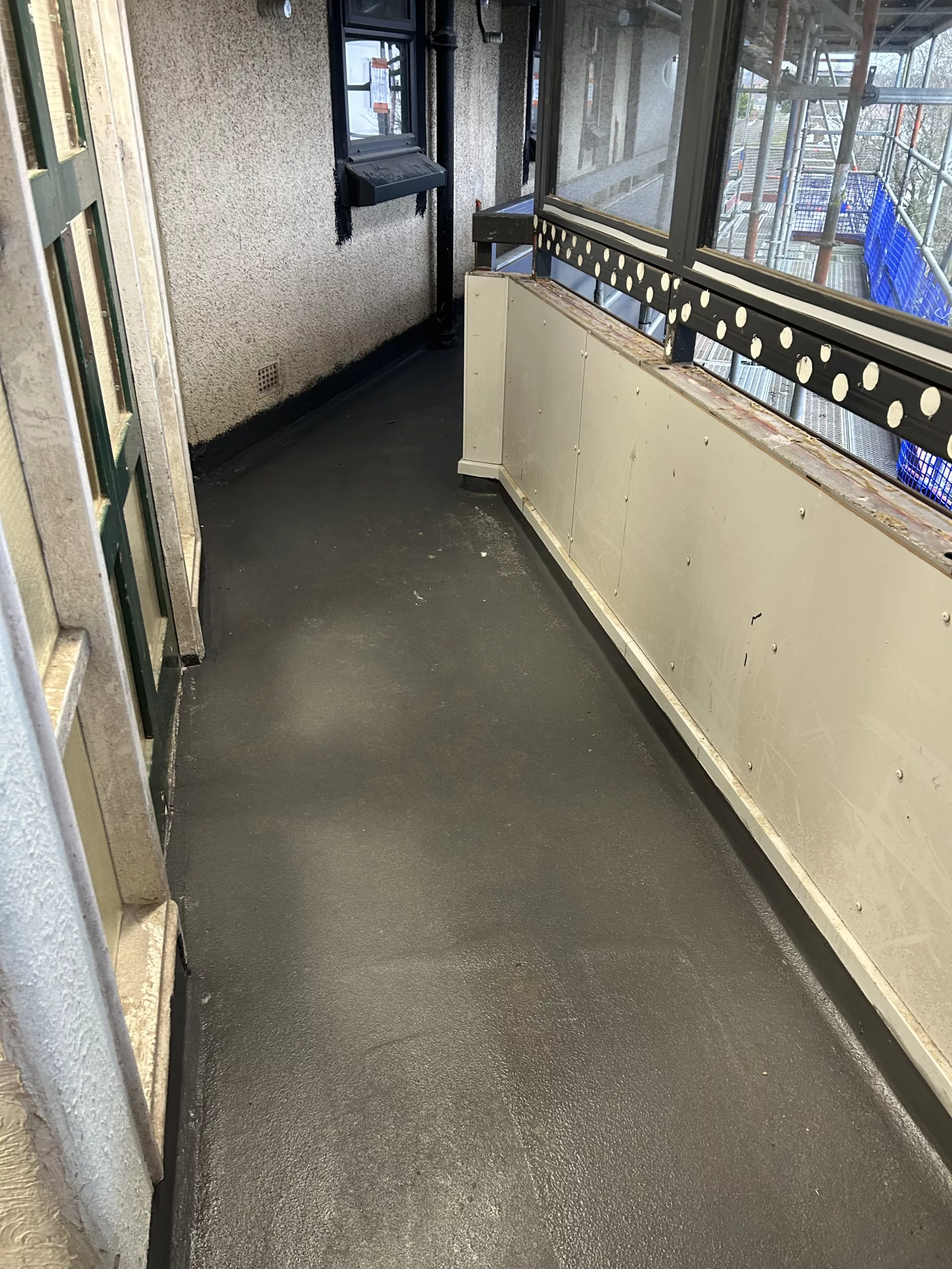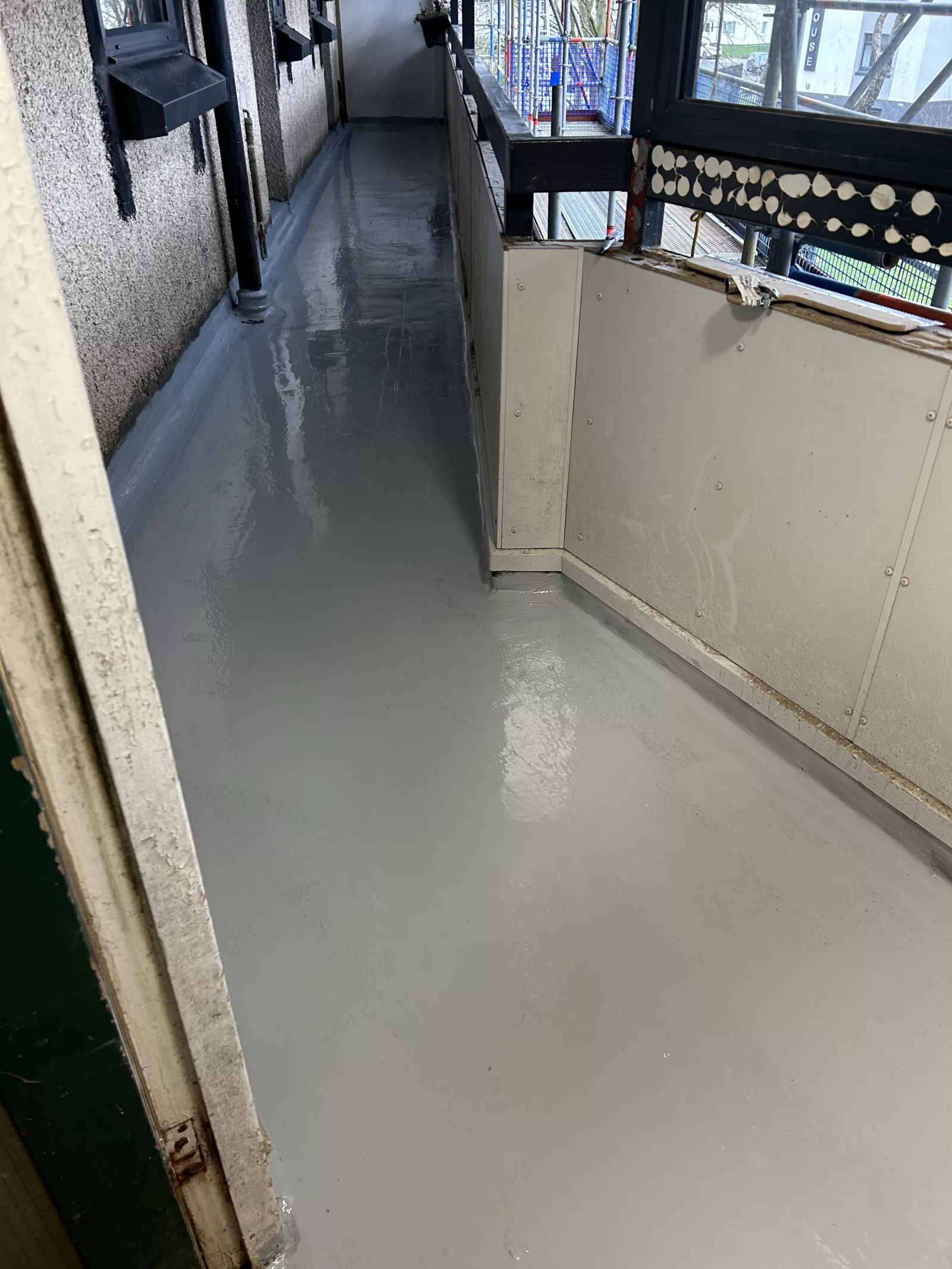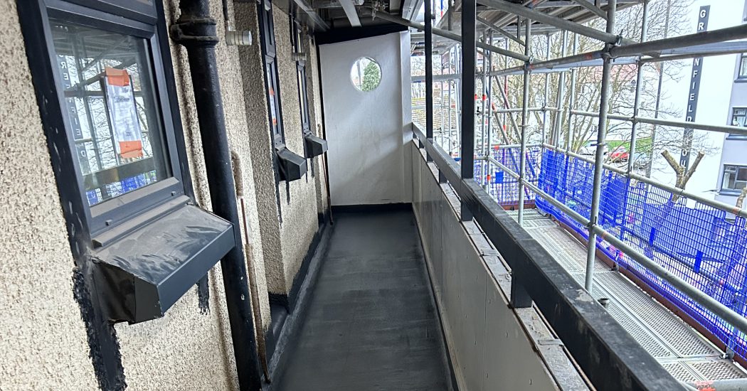 Specialist UK Restorations refurbished the balcony decking on each of the 5 levels of each block using the Vulkem waterproofing system, chosen for its durability, slip resistance, and suitability for live residential environments.