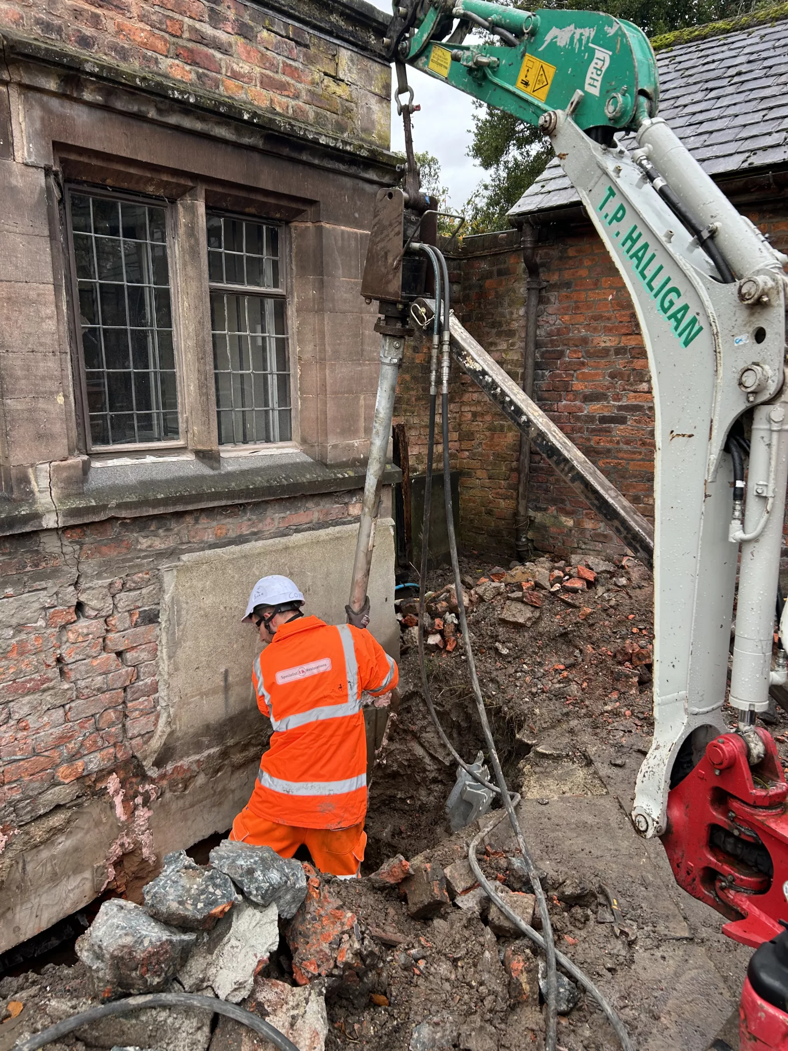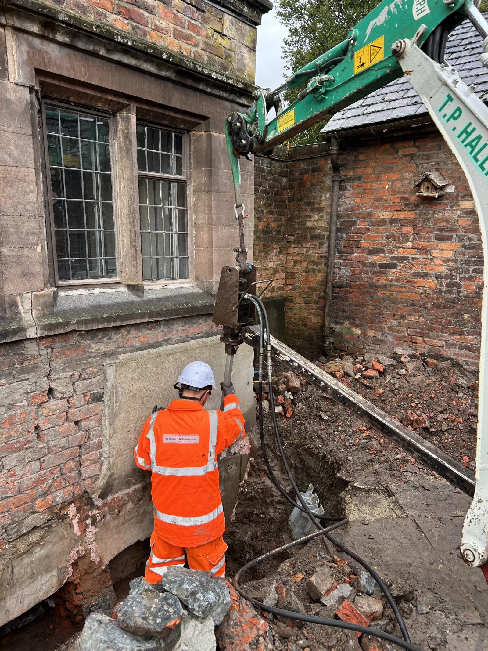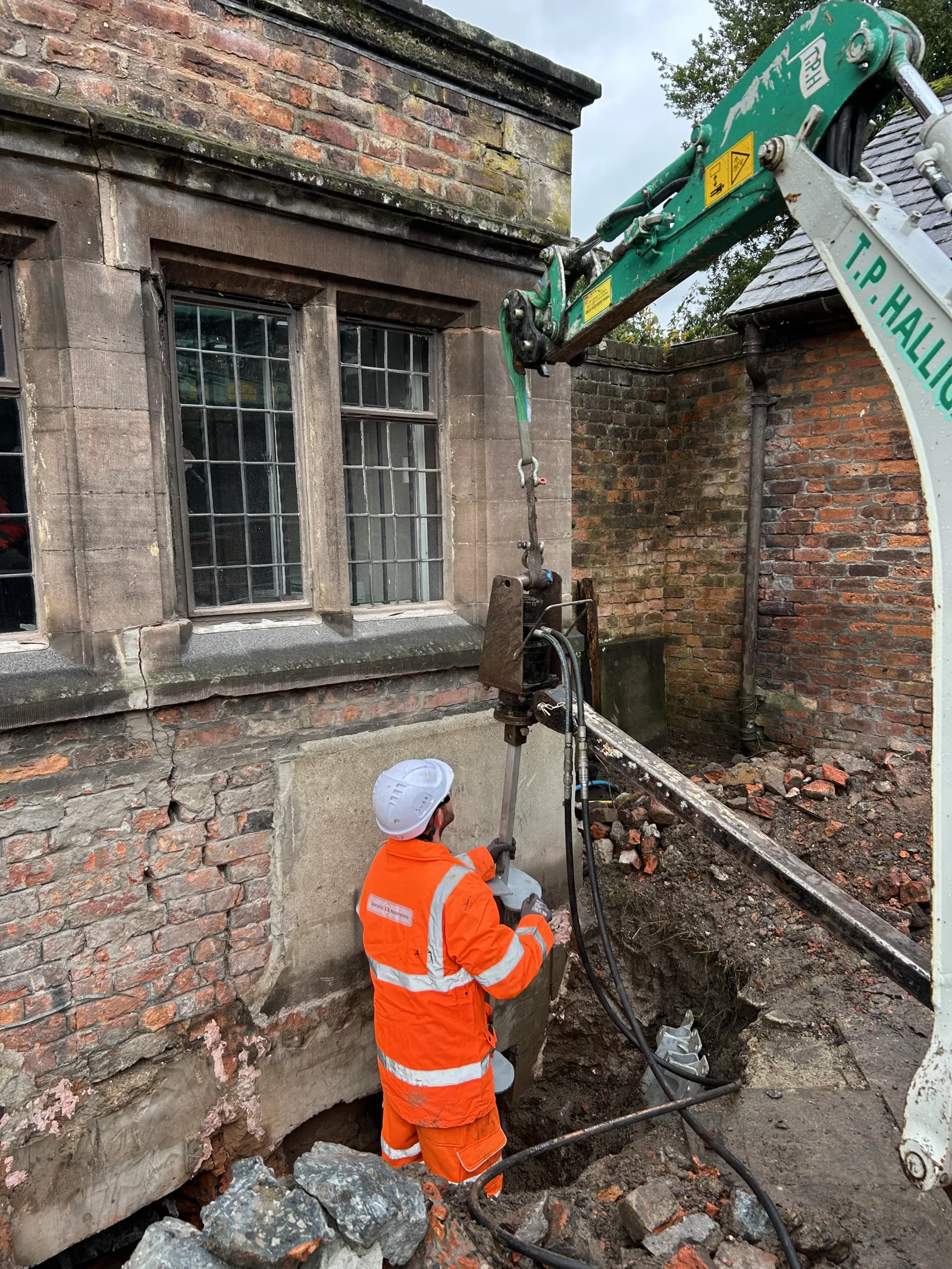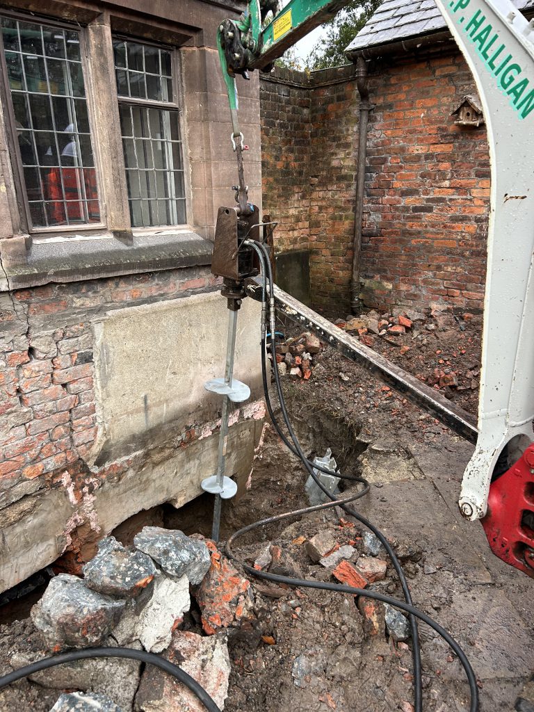 Following investigations identifying subsidence caused by historic ground conditions over a backfilled moat, Specialist UK Restorations installed Helifix Micro-Piles to stabilise the bay window and adjoining courtyard wall. Works included controlled excavation, localised underpinning adjustments, and installation of micro-piles designed to transfer loads to stable ground.